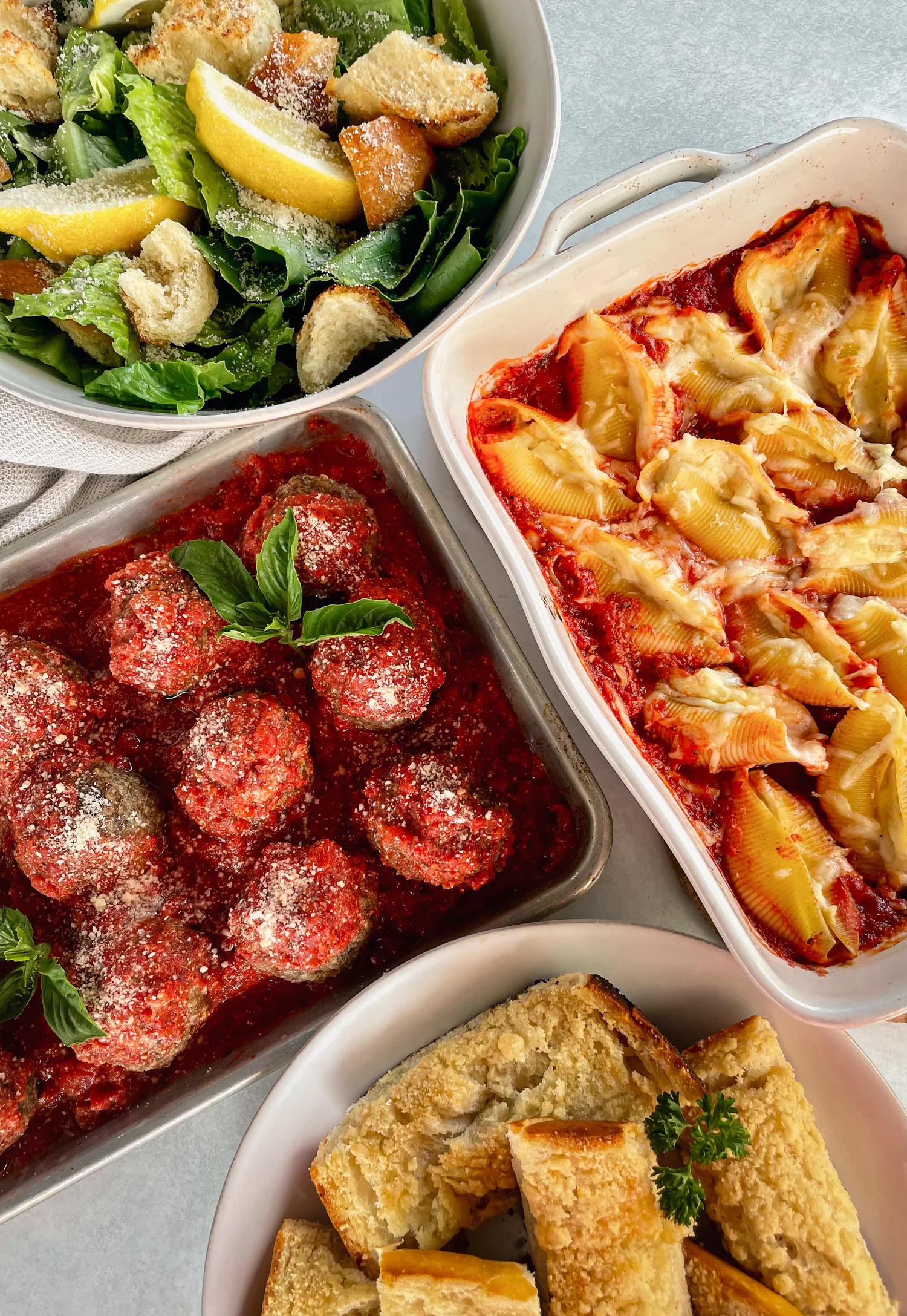 Stuffed Shells, Side of Meatballs, Garlic Bread, leftover Salad Cheesecake Bites |